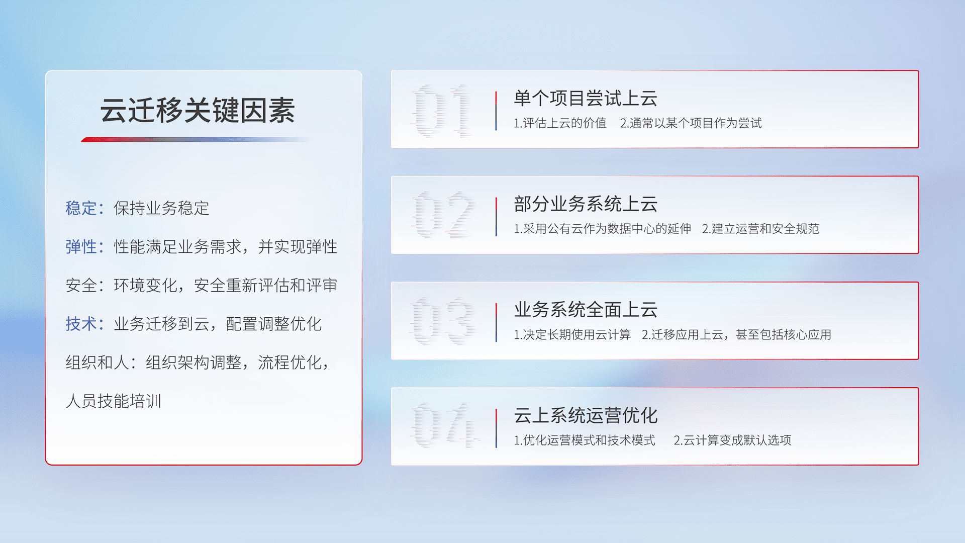 结合实际业务,,,从规划设计、、云平台选型、、、、云原生改造、、数据迁移、、集成交付,,,,迁移全过程为客户识别最佳上云路径,,,做好风险识别管理,,,,设计网络架构、、身份权限、、、安全审计合规、、、操作审计、、、、日志审计、、、、监控告警策略、、、、多站点容灾设计等,,,,对云上基础设施进行整体规划,,,提升IT治理水平,,,,以满足弹性、、、、高可用、、、高性能的需求。。。