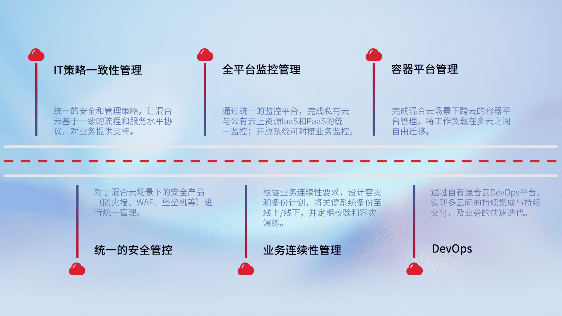通过多云纳管,,以统一的资源数据模型把客户的云资源进行抽象和封装,,进而实现对多云资源的统一操作,,,,保障云资源管理的可靠性、、、稳定性与可用性。。量身定制化运维内容,,配置、、、、开发运维、、、、补丁管理、、、备份、、、监控、、、、认证和访问管理、、审计和日常巡检等,,,,保障在用云过程中的可靠度,,,稳定度以及高可用率。。。