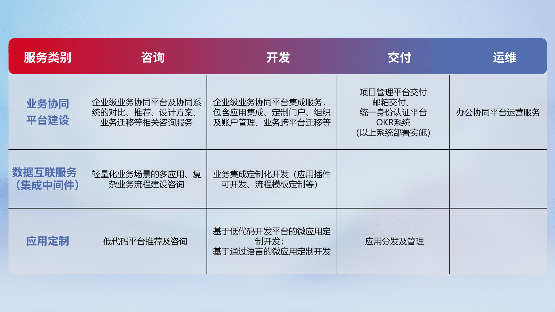 针对钉钉、、、企微、、、IDaas等平台级产品提供产品的规划、、方案、、、、交付、、、、定制化开发等服务,,实现如统一协同办公、、智能客户服务、、、、混合会议管理、、智能数据查询、、、等业务场景,,,实现数字化转型。。